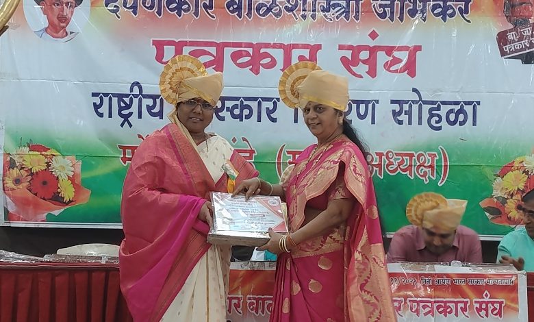 नाशिक (प्रतिनिधी) दर्पण कार बाळशास्त्री जांभेकर पत्रकार संघ तसेच संघाचे राष्ट्रीय अध्यक्ष डॉ. महेंद्र देशपांडे यांच्या मार्गदर्शनाखाली भव्य व दिव्य असा जागतिक राष्ट्रीय महिला दिनानिमित्त सामाजिक, राजकीय, क्रीडा अशा अनेक क्षेत्रात उल्लेखनीय कार्य करणाऱ्या महिलांचा दामिनी राष्ट्रीय पुरस्कार देऊन सन्मानित करण्यात आला. त्या पुरस्कार समारंभासाठी अनेक राज्यातून तसेच जिल्ह्यातून अनेक महिलांनी मोठ्या प्रमाणात सहभाग नोंदवला या कार्यक्रमात अनेक क्षेत्रातील मान्यवर उपस्थित होते त्यांचे हस्ते जागतिक महिला दिनानिमित्त हा दामिनी राष्ट्रीय पुरस्कार देण्यात आला. यामध्ये लोकनियुक्त शिर्डी नगर परिषदेच्या नगराध्यक्षा रणरागिनी मा. सौ जयश्रीताई थोरात यांनी सामाजिक व राजकीय क्षेत्रात तसेच जनसेवा फाउंडेशनच्या माध्यमातून उल्लेखनीय कार्य केल्याबद्दल दर्पणकार बाळशास्त्री जांभेकर पत्रकार संघाच्या वतीने राष्ट्रीय अध्यक्ष डॉ. महेंद्र देशपांडे यांच्या हस्ते नाशिक येथे दामिनी राष्ट्रीय पुरस्कार प्रदान करण्यात आला . या दामिनी राष्ट्रीय पुरस्कारामुळे शिर्डी नगर परिषदेच्या नगराध्यक्षा यांचा अनेक स्तरातून कौतुक व शुभेच्छाचा वर्षाव करण्यात आला.