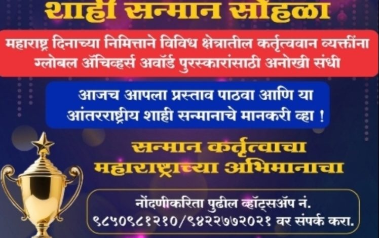 दर्पणकार बाळशास्त्री जांभेकर पत्रकार संघाच्या वतीने महाराष्ट्र दिनानिमित्त नाशिक येथे भव्य दिव्य International Global Achievers Award सन्मान सोहळ्याचे आयोजन करण्यात आले आहे. या आंतरराष्ट्रीय पुरस्कारासाठी पत्रकारिता, साहित्य, कला, क्रीडा, शिक्षण, सामाजिक, औद्योगीक, वैद्यकीय, उद्योजक, संगीत, धार्मिक, अध्यात्मिक, सहकार, महिला व बालविकास आदी विविध क्षेत्रात विशेष उल्लेखनीय कार्य केलेल्या विविध क्षेत्रातील व्यक्तींकडून प्रस्ताव आमंत्रित करण्यात येत आहेत.