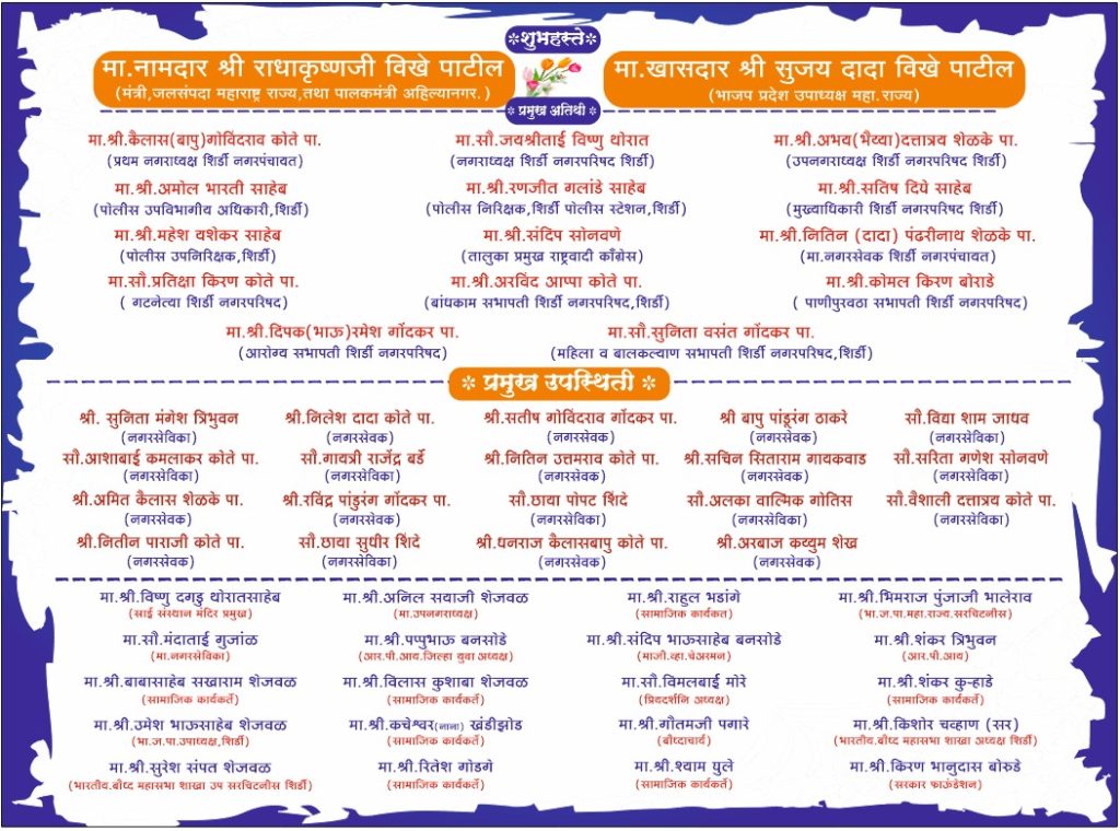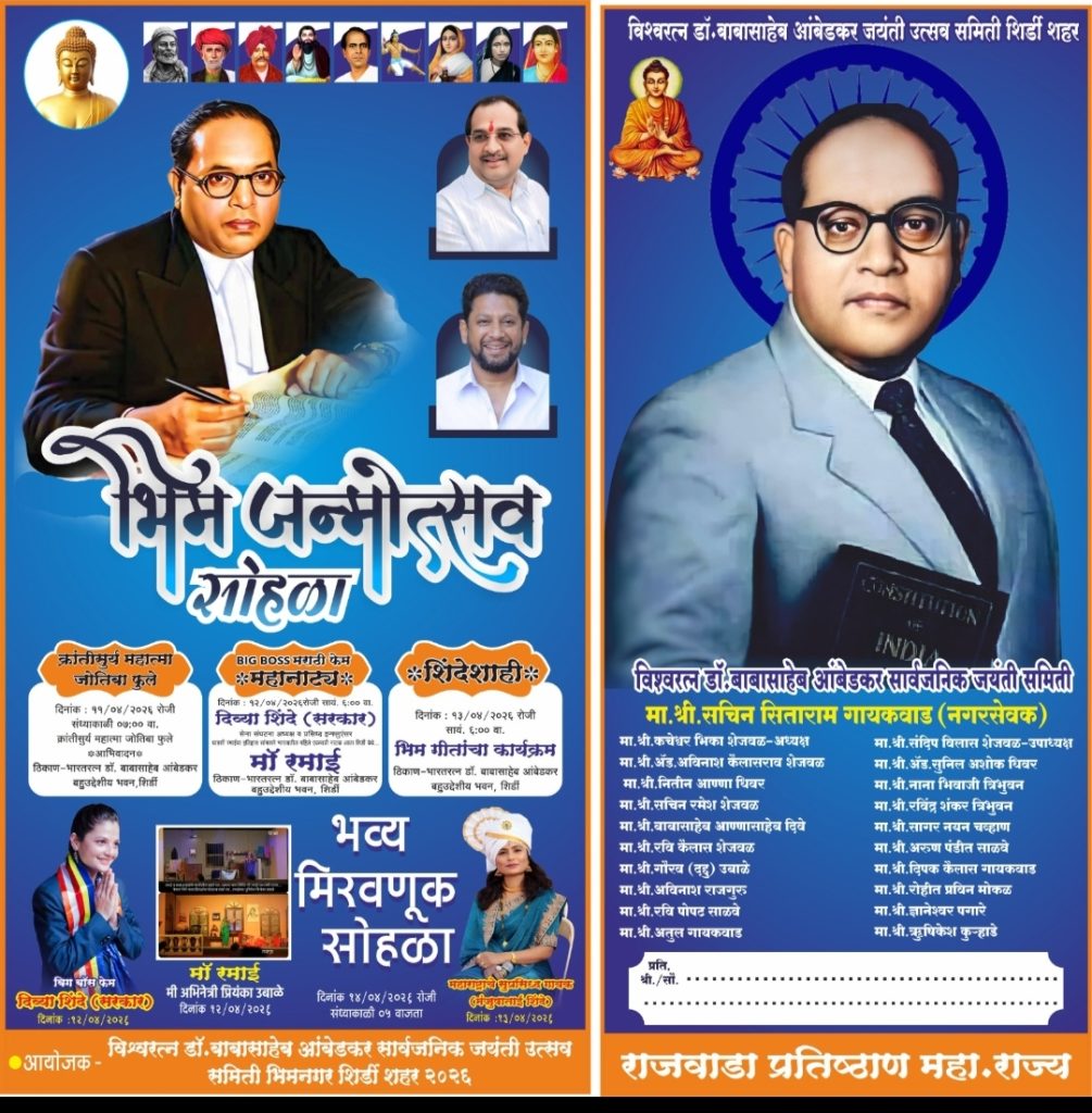 शिर्डी (प्रतिनिधी) विश्वरत्न डॉ. बाबासाहेब आंबेडकर १३५वी जयंती महोउत्सव सार्वजनिक उत्सव समिती भिम नगर शिर्डी पालकमंत्री मा. श्री राधाकृष्ण विखे पा. भाजपा महाराष्ट्र प्रदेश उपाध्यक्ष मा. श्री सुजय दादा विखे पा. यांच्या शुभ हस्ते तसेच मा. श्री सचिन भाऊ गायकवाड नगरसेवक शिर्डी नगरपरिषद मा .श्री नितीन भाऊ धिवर सामाजिक कार्यकर्ता राजवाडा प्रतिष्ठान यांच्या कुशल मार्गदर्शनाखालीभीम जन्मोत्सव सोहळ्याचे कार्यक्रम पुढील प्रमाणे दिनांक-१२/०४/२०२६ रोजी सायंकाळी ०६ वा. (बिग बॉस फेम) दिव्या शिंदे (सरकार) यांचा व्याख्यानाचा तसेच धाडसी रमाईचा इतिहास सांगणारे माता रमाई भारतातील पहिले एकपात्री नाटक अभिनेत्री प्रियंका उबाळे यांच्या अभियानातून तसेच दिनांक १३/०४/२०२६ रोजी संध्याकाळी ०६ वा. मोठ्या जल्लोसात महाराष्ट्राचे सुप्रसिद्ध गायक मंजुषा ताई शिंदे यांचा भीम गीताचा कार्यक्रम तसेच दिनांक १४/०४/२०२६ रोजी सायंकाळी ०५ वा. पाच वाजता भव्य व दिव्य असा डॉ. बाबासाहेब आंबेडकर यांच्या प्रतिमेची भव्य मिरवणूक सोहळा भीम नगर मधून निघणार आहे. भीम जन्मोत्सव सोहळा मा. ना. श्री राधाकृष्ण विखे पा. तसेच भाजपा प्रदेश उपाध्यक्ष महाराष्ट्र राज्य मा.श्री सुजय दादा विखे पा. यांच्या शुभहस्ते तसेच प्रथम नगराध्यक्ष मा. श्री कैलास बापू कोते लोकनियुक्त नगराध्यक्षा सौ. जयश्रीताई थोरात उपनगराध्यक्ष मा. श्री अभय भैया शेळके मा. श्री अमोल भारती उपविभाग अधिकारी शिर्डी मा. श्री रंजीत गलांडे पोलीस निरीक्षक शिर्डी मा. श्री सतीश दिघे मुख्याधिकारी शिर्डी नगरपरिषद मा .श्री महेश यशेकर उपनिरीक्षक शिर्डी मा .श्री संदीप भाऊ सोनवणे तालुका अध्यक्ष राष्ट्रवादी काँग्रेस मा .श्री. नितीन दादा शेळके मा.नगरसेवक शिर्डी मा . सौ. प्रतीक्षा किरण कोते पा. गट नेता शिर्डी नगरपरिषद मा .श्री अरविंद अप्पा कोते बांधकाम सभापती शिर्डी नगरपरिषद मा .सौ कोमल किरण बोराडे पाणी पुरवठा सभापती शिर्डी नगरपरिषद मा. श्री. दीपक भाऊ गोंदकर आरोग्य सभापती शिर्डी नगरपरिषद मा. सौ . सुनिता वसंत गोंदकर महिला व बालकल्याण सभापती शिर्डी नगरपरिषद यांच्या प्रमुख अतिथी तसेच सन्माननीय सर्व नगरसेवक यांच्या प्रमुख उपस्थितीत डॉ. बाबासाहेब आंबेडकर जयंती उत्सव समितीचे मार्गदर्शक मा.श्री सचिन भाऊ गायकवाड नगरसेवक शिर्डी नगर परिषद तसेच मा. श्री. नितीन भाऊ धिवर सामाजिक कार्यकर्ते राजवाडा प्रतिष्ठान शिर्डी तसेच समितीचे अध्यक्ष मा .श्री. कचेश्वर भिका शेजवळ उपाध्यक्ष मा. श्री संदीप विलास शेजवळ तसेच सर्व पदाधिकारी सामाजिक कार्यकर्ते यांच्या उपस्थितीत डॉक्टर बाबासाहेब आंबेडकर जन्मोत्सव सोहळा साजरा करण्यात येणार आहे तरी सर्व बांधवांनी वरील कार्यक्रमा